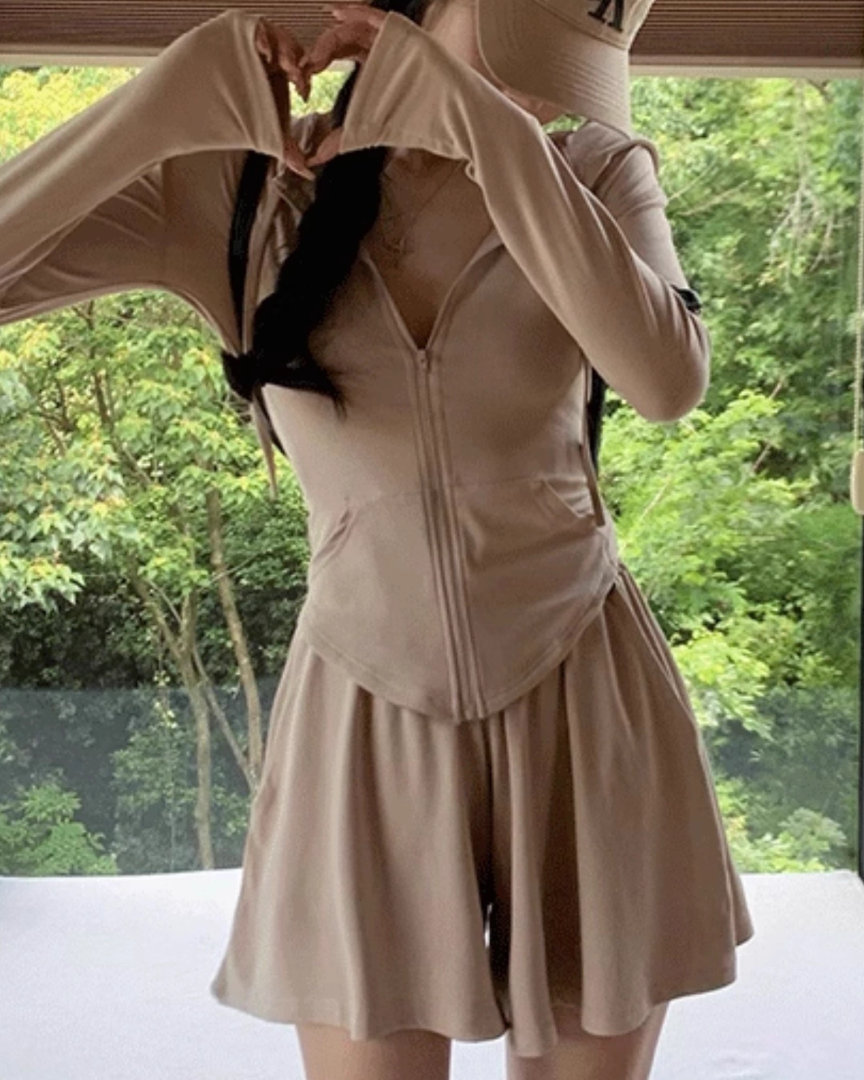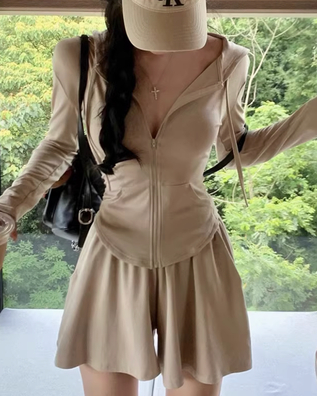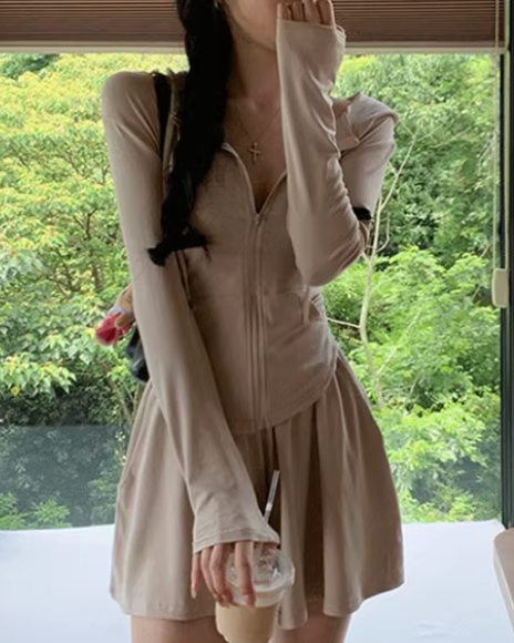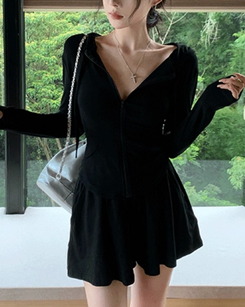 カジュアルでありながら女性らしいシルエットが特徴のジップアップフード付きワンピース。軽やかな素材感で、日常使いにぴったりのアイテム。ベージュとブラックの2色からお選びいただけます。