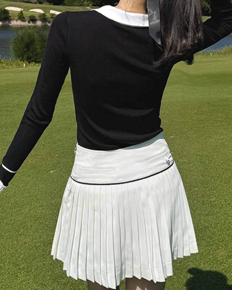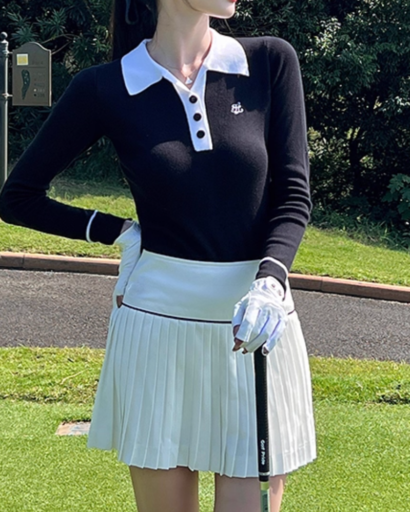 モダンでスタイリッシュな黒×白のゴルフウェアセット。フィット感のある長袖ポロシャツとエレガントなプリーツスカートの組み合わせ。スポーツやアウトドアに最適なデザインで、動きやすさとファッション性を両立。