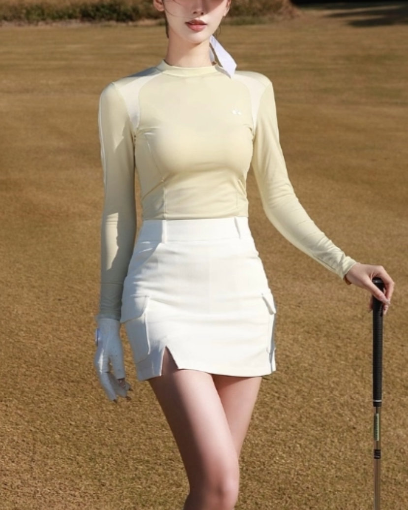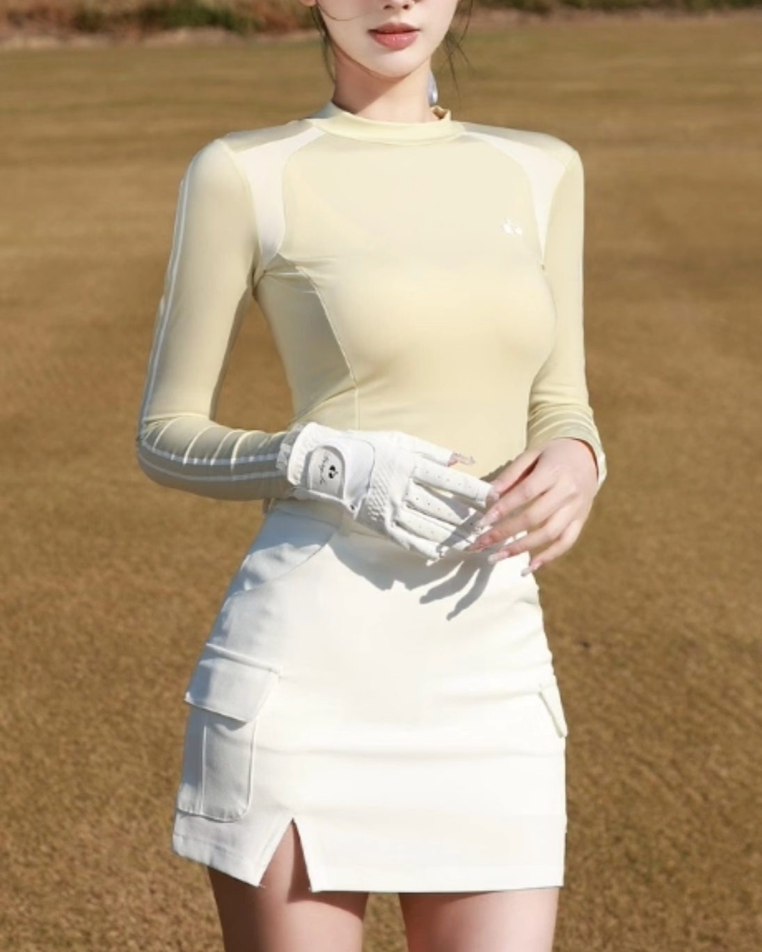 スポーティーでありながら、女性らしいシルエットを引き立てるセットアップ。ベージュとホワイトのコンビネーションがエレガントで、ゴルフやカジュアルなお出かけに最適。伸縮性のある素材で動きやすさも抜群。スマートで洗練されたデザインが、スポーツウェアに新しい魅力を加えます。