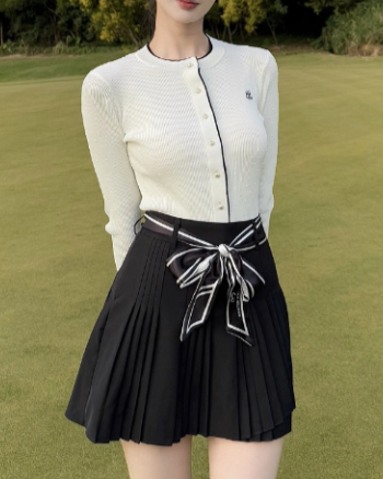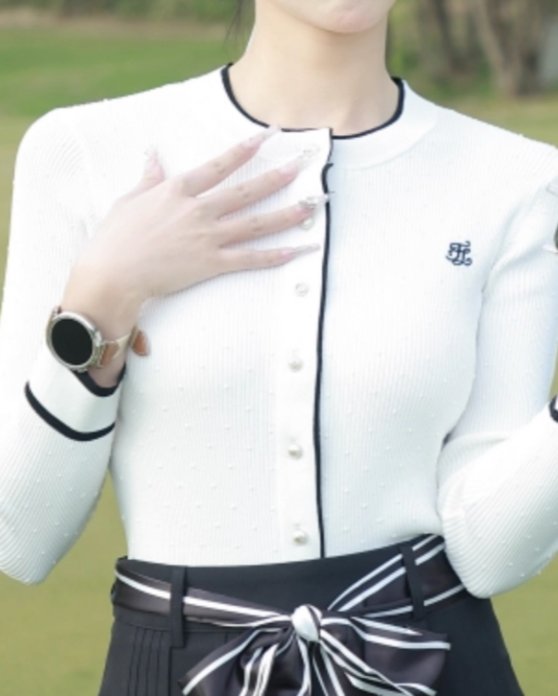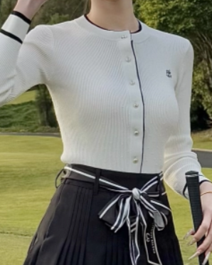 上品なパールボタンと配色ラインがポイントのリブニット。フィット感のあるシルエットで、ゴルフからタウンユースまで幅広く活躍。