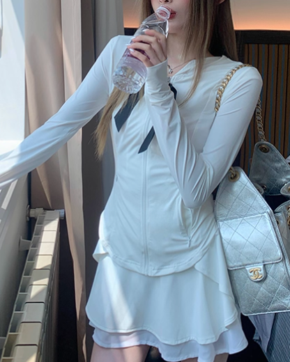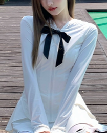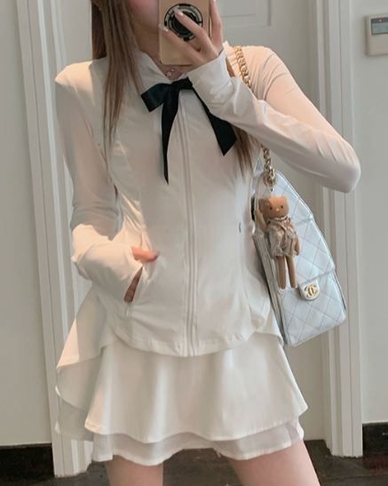 シンプルなジップデザインにブラックリボンが映える一枚。フィット感のあるシルエットで、スポーティーさと可愛らしさを両立。