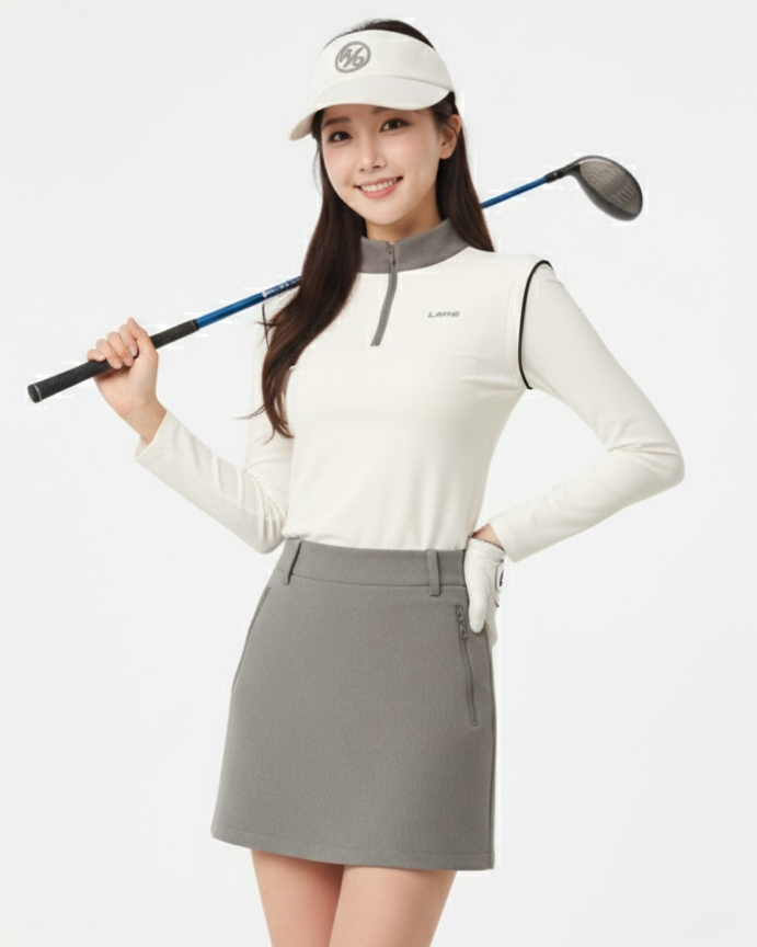 女性らしい上品さと動きやすさを両立したゴルフセットアップ。ハイウエストの台形スカートは脚を美しく見せ、サイドスリット入りで動きやすさも確保。インナーパンツ付きでプレー中も安心です。