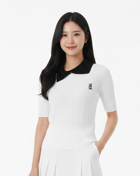立体感のあるリブニット素材が身体にやさしくフィットし、すっきりとした美しいシルエットを演出。配色のビッグカラーとリボンデザインが顔まわりを華やかに見せ、シンプルながら印象的な一着。